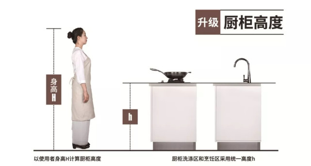 洗碗不弯腰、不溅水,就是比较合适的高度了。 // 4、灶台——炒菜 // 炒菜的灶台区域,主要是在炒菜的时候用,这里的高度参考是——锅放在灶台上、人直站在灶台前,手放松状态平拿着的锅铲高度齐平或略高于锅边高度,这样炒菜就不用架着手。